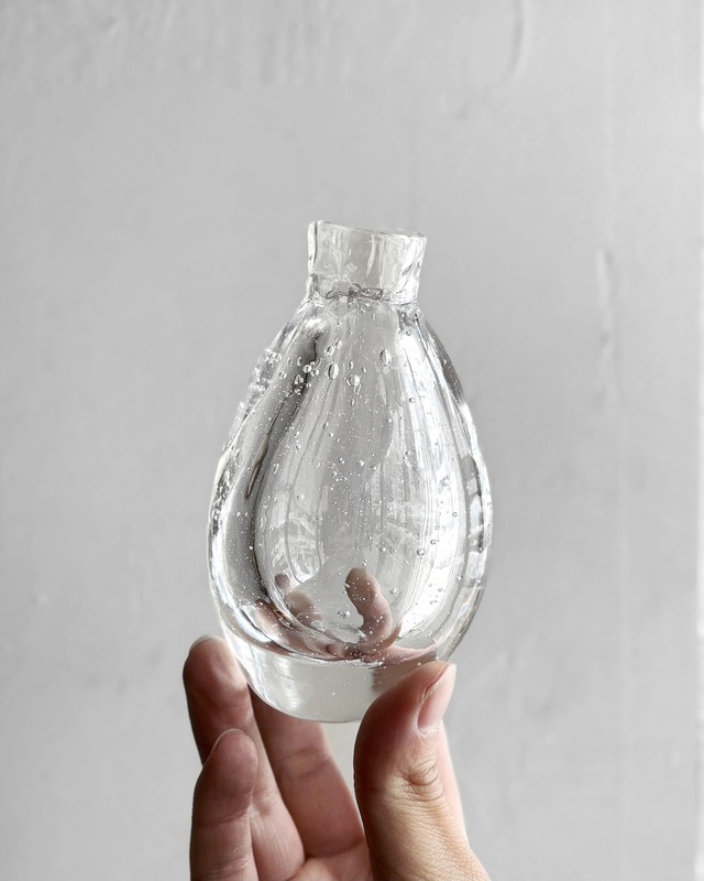 ■DESCRIPTION 栗原しほさんの花瓶。 ずっしりぽてっと、とても肉厚で重量感があります。 水をそのまま留めたような、不思議な塊です。 ずっと眺めていたくなるような繊細な仕事ですが、 栗原さんのガラスはほどよく厚みがあって丈夫で、手に馴染む重量感があって。 あくまでも毎日の暮らしの中で使うことが大前提にあります。 果物やヨーグルト、サラダを盛るボウルや、 ビールをたっぷりと注ぐグラス、 その辺でつんだ野草を挿しても映える一輪挿し。 瑞々しくて艶やかな手しごとから生まれる様々なガラスたち。 生活のなかにあったらそれだけで日々が楽しくなるような。 そんな魅力が詰まっています。 1点1点、手作りの吹きガラスです。 形、大きさもまちまちですので、寸法をご確認の上ご検討ください。 -------------------------------------- 栗原さんより↓ 水と光をテーマにして吹きガラス制作をしています。 有機的で流動的なイメージと、 涼やかで気負いのない存在のガラスを目指しています。 日常に寄り添い、 時にはそっと生活に彩りを与えられるような ガラスでありたいです。 ■CONDITION 新品 ■MATERIAL made in JAPAN ■SIZE 最大幅 / 7.5㎝ 高さ / 12.5㎝ 口(内径) / 約2.7㎝