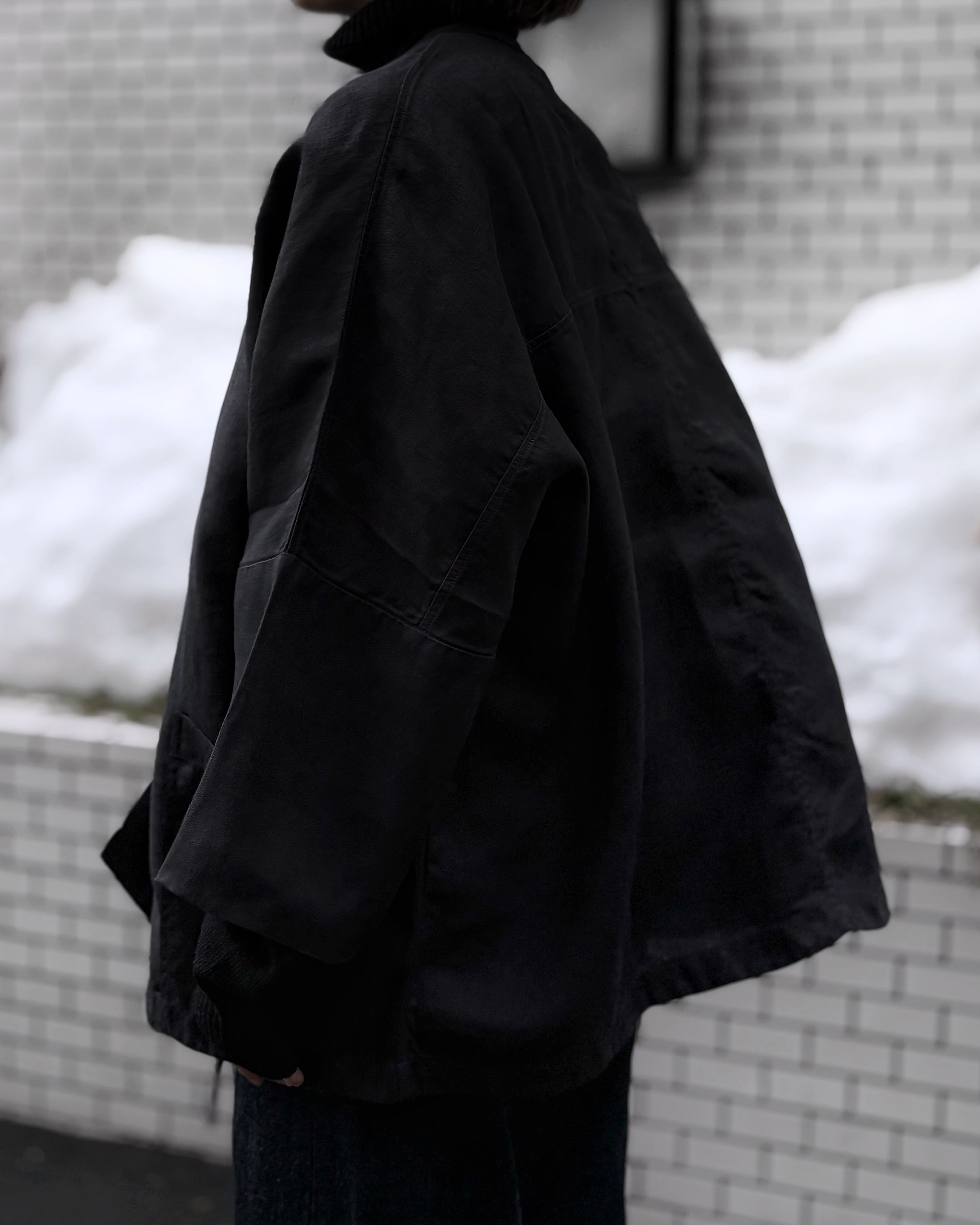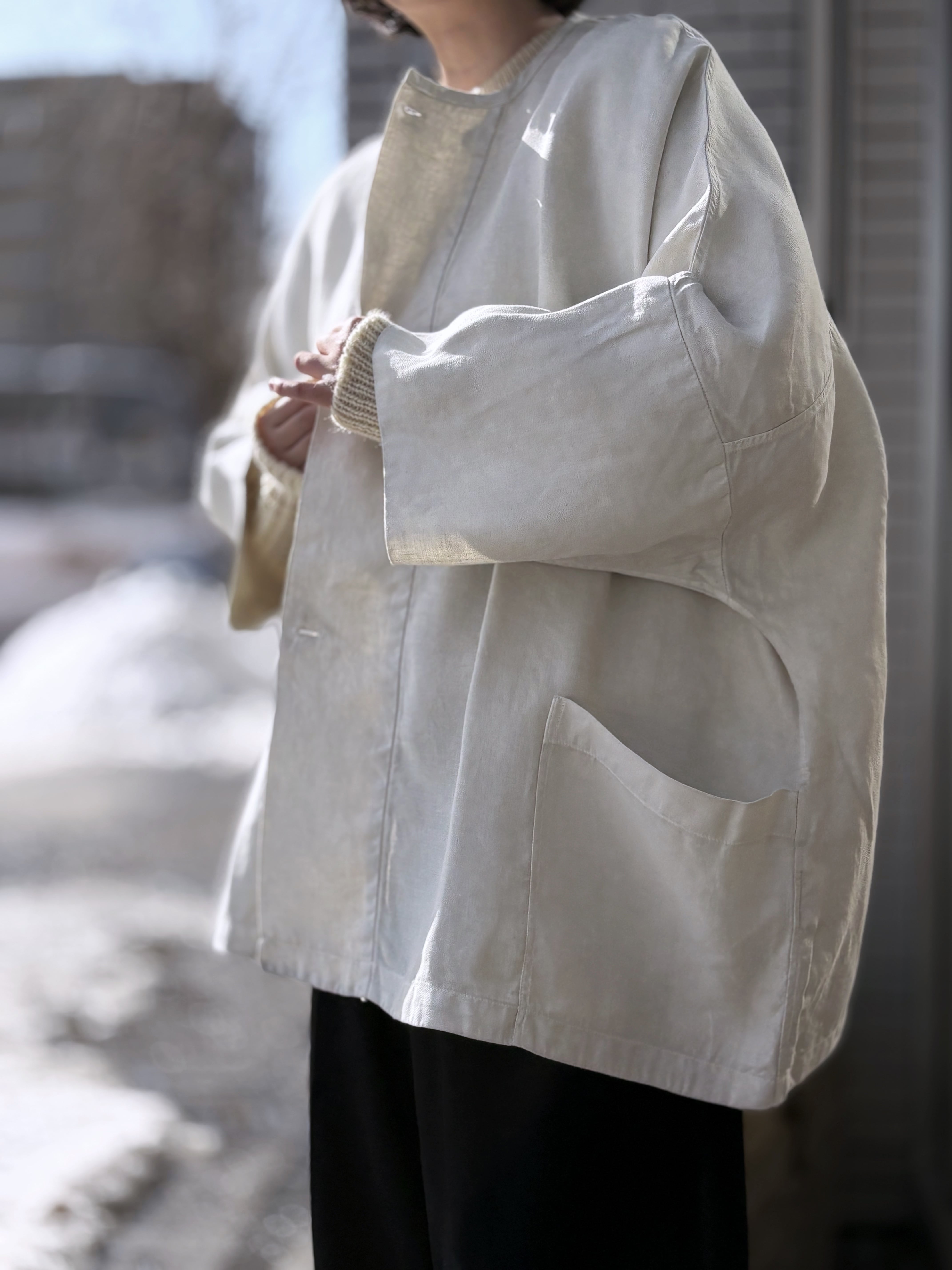非常にたっぷりと取られた身幅と独特な袖付け、中に着るものを選ばないリラックス感のあるフィッティング。